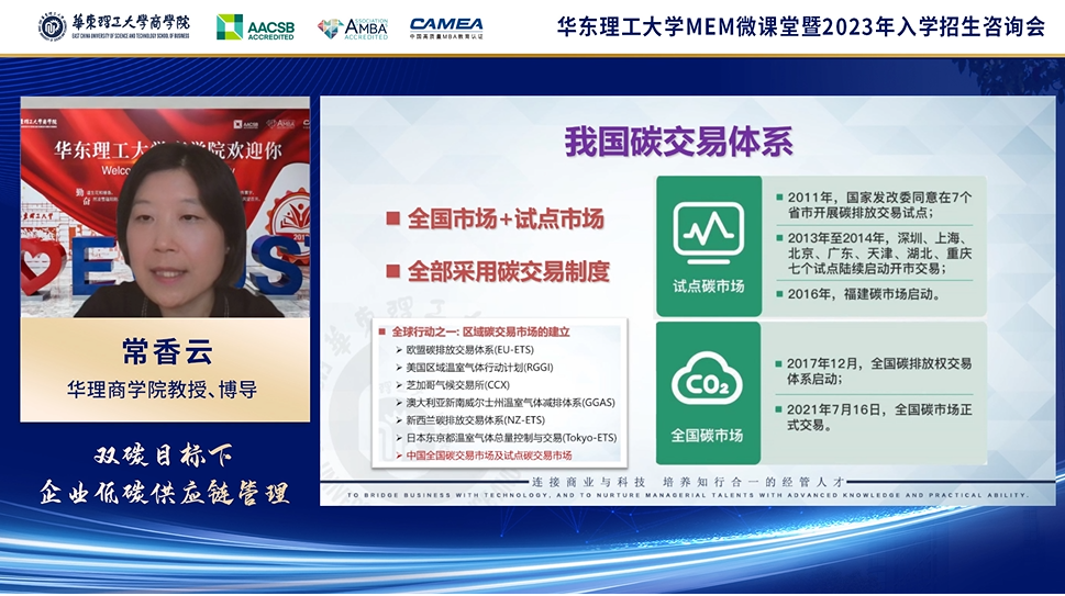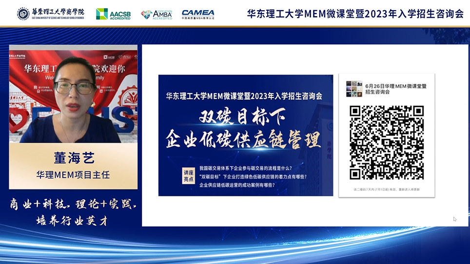 6月26日下午,华理MEM微课堂《双碳目标下企业低碳供应链管理》暨2023入学招生咨询会于云端成功举办。