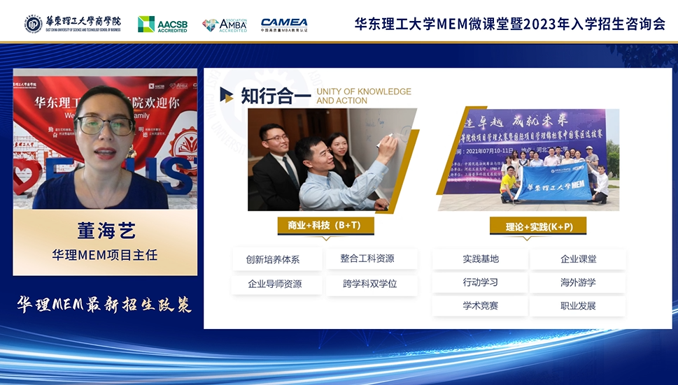 董海艺老师对2023华理MEM项目优势与最新招生政策展开了全方位介绍。董老师表示,华理MEM强调知行合一,具有创新培养体系、整合工科资源、企业导师资源、跨学科双学位等优势,为学生提供实践基地、企业课堂、行动学习、海外游学与学术竞赛等机会与平台,多维度赋能学生职业发展。此外,在华理读MEM不仅可以学习专业的知识体系,还有机会获得IPMP证书和PMP证书。