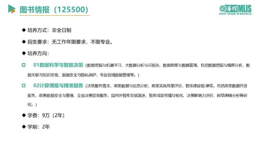 薛老师还透露,2026级将图书情报专业(代码125500,非全日制)纳入招生,该专业无工作年限要求、不限专业,应届生与在职党均可报考;2年学制学费仅9万,设“数据科学与智能决策”“计算情报与精准服务”两大方向,课程涵盖数据挖掘、机器学习、政策数据分析等核心内容,为信息时代人才提供“信息处理+管理决策”的跨界发展通道。