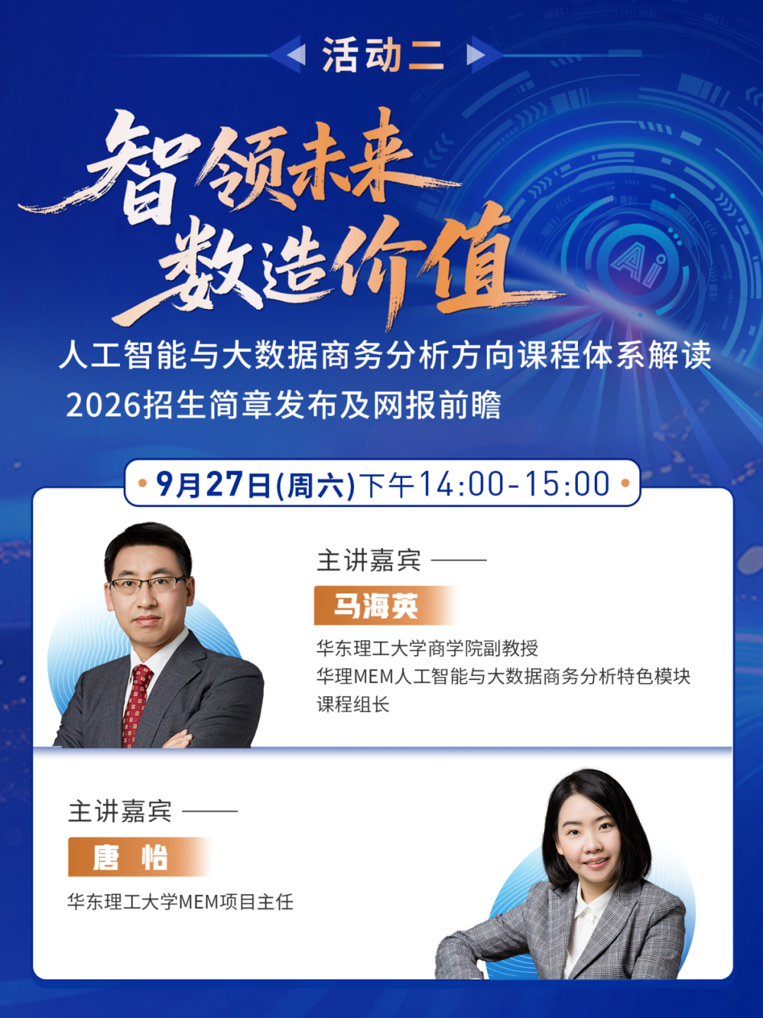 9月27日(周六)14:00,华理MEM“人工智能与大数据商务分析”专场直播即将开启,欢迎关注华东理工大学MEM官方微信和官网,获取最新招生政策以及报考全攻略,携手华理开启从“技术骨干”到“管理精英”的进阶之路!