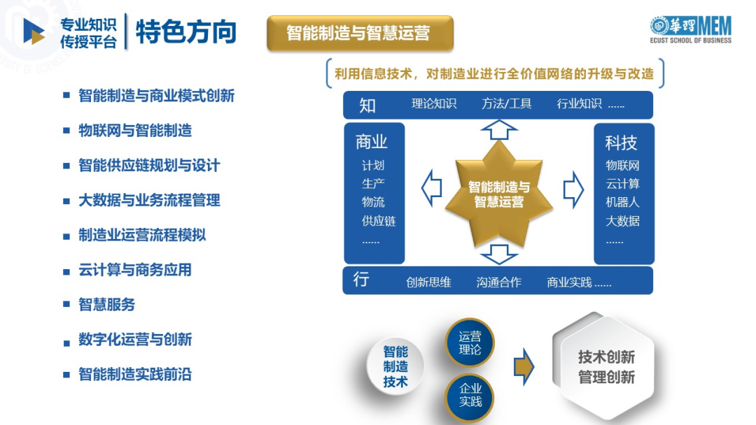 而华理MEM智能制造与智慧运营方向,正是为培养这样的“掌舵者”而来。针对华理MEM智能制造与智慧运营特色模块,彭教授介绍,该模块融合商业思维与互联网、云计算、大数据等前沿技术,开设物联网与智能制造、智能供应链规划等九大核心课程。课程通过企业实地参访、高管实战分享、跨院校师资联动,实现“理论+实践”深度融合,培养兼具技术洞察力与商业决策力的复合型人才,为制造业转型升级输送关键力量。