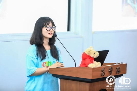 随后,华东理工大学商学院2022级研究生代表王苏杭同学讲述了自己参加夏令营的经历,并通过分享一年来在华理学习和生活的点点滴滴,让营员们真切感受到华理人求真务实的治学态度和团结协作的校园文化。