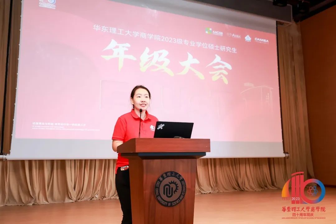 2023年9月10日下午,华东理工大学商学院2023级MEM新生第一次年级大会在商学院406报告厅举行。MEM项目学术主任杨洪涛老师、MEM项目主任唐怡老师、MEM项目主任助理石金老师、教学培养主任助理陈静洁老师、学位管理顾梅老师、年级辅导员姚颖老师、职业发展中心主任助理安云鹏老师和王梦冰老师、校友代表杨祺帆、班导师薛晓娟、宋黎雯老师以及全体MEM 新生参会,会议由项目主任唐怡老师主持。