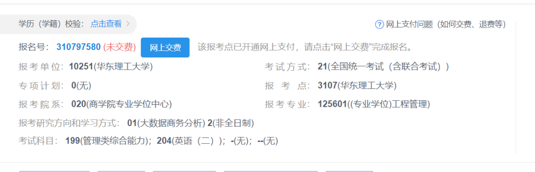 请选择华东理工大学考点(3107)考试的考生在“研招网”报名后在该网站及时缴纳报考费。选择其他报考点的考生则按照当地报考点的要求缴纳报考费。
