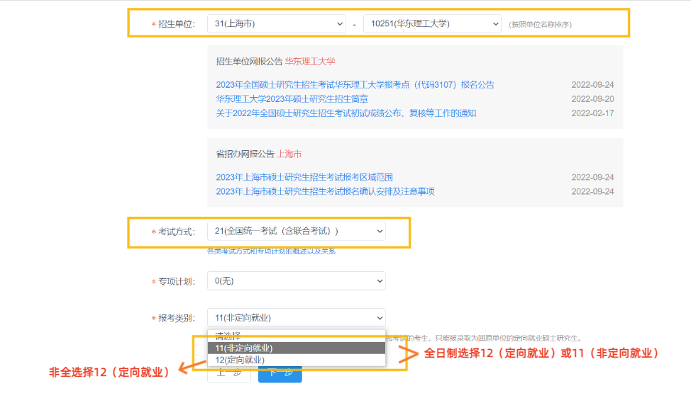 (2) 报考非全日制项目的考生项目的考生请选择12(定向就业)。