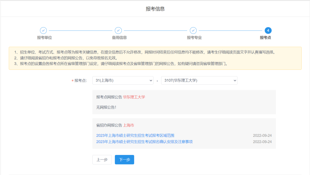 招生单位、考试方式、报考点关键信息不允许修改,若填写错误,只能取消报名信息后,再新增一份新的报名信息。