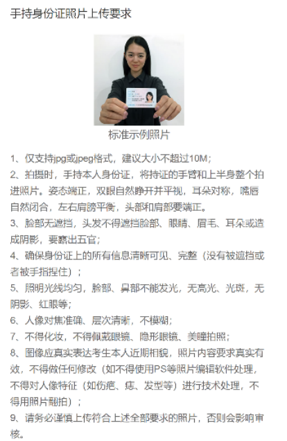 考生须于上述规定时间内登录网上确认平台,通过网上确认系统完成所有网上确认步骤,包括核对网报信息、上传准考证照片(本人图像)、上传手持身份证照片及其它相关材料照片”等手续。图片上传过程中请耐心等待,不要频繁刷新。逾期不再补办,未完成网上确认或网上确认审核不通过的考生,不能在本报考点参加考试。