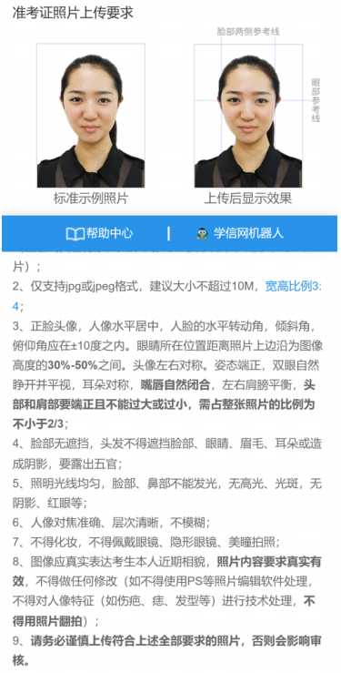 本人近三月内正面、免冠、无妆、彩色电子证件照。该照片将用于初试准考证、录取登记表、校园一卡通等,请务必按要求上传。照片要求见下图(白色背景):